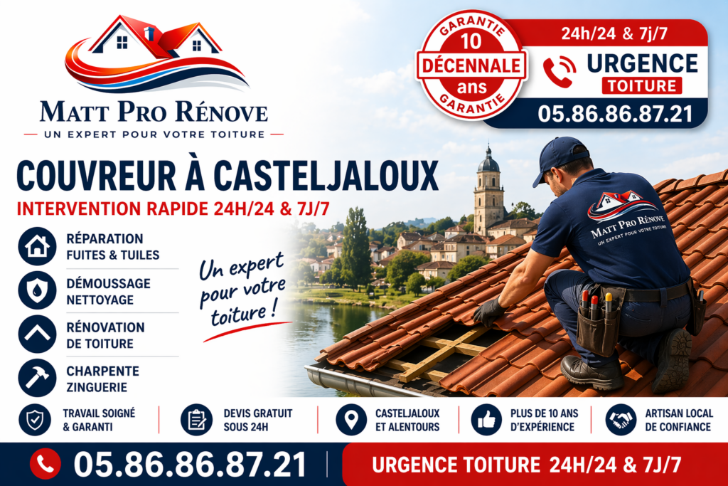 Matt Pro Rénove accompagne les particuliers et les professionnels pour les travaux de toiture à Casteljaloux avec une approche sérieuse, locale et orientée durabilité.